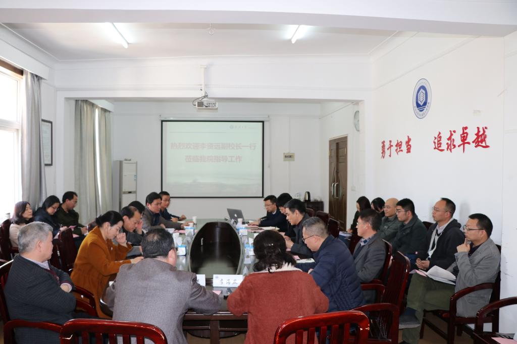 2019年3月12日下午,联系永利官网的校领导李资远副校长一行到学院调研并指导工作。学校后勤保障部基建管理处副处长周韶伟、房产管理中心主任罗定英、党政办公室政策研究室副主任张丽平、基建管理处维修管理室副主任秘书蔡辉旺,学院全体院领导、各系(办)支部书记和主任参加座谈。会议由学院党委书记雷世富主持。