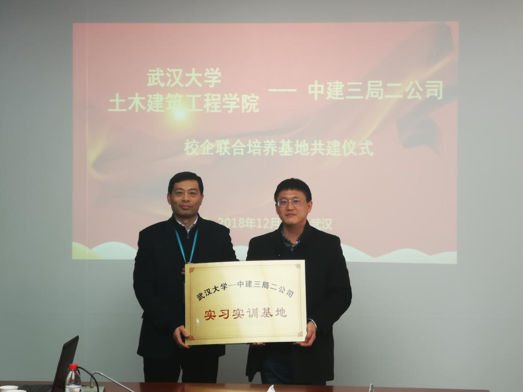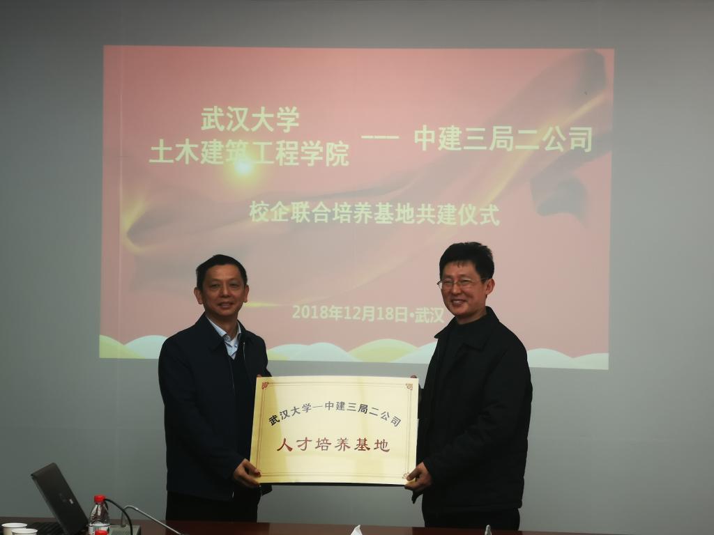 2018年12月18日,学院党委书记雷世富、党委副书记谢献谋、副院长邹维列、学工办主任余娟、教学办主任胡俊峰一行5人,赴中建三局二公司,就校企合作等相关事宜进行洽谈,并为校企联合培养基地揭牌。中建三局二公司副总经理周必成、副总经理徐国政、企业文化部部长程莞茹、人力资源部副经理汤斌、人力资源部业务经理刘建华及二公司武大校友代表出席了座谈会。