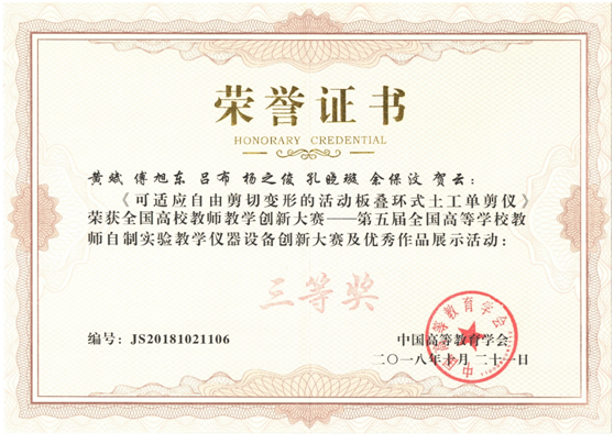 2018年10月19日~21日,全国高校教师教学创新大赛——第五届全国高等学校教师自制实验教学仪器设备创新大赛及优秀作品展示活动于四川省成都市世纪城新国际会展中心举办。由永利官网傅旭东老师和黄斌老师共同完成的作品《可适应自由剪切变形的活动板叠环式土工单剪仪》顺利进入决赛,并荣获本届大赛三等奖。