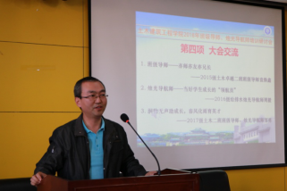 大会经验交流环节,2015级土木工程卓二班班级导师袁焕鑫老师从老师、朋友、兄长三种身份入手,介绍了自己的工作经验,该班因综合实力突出荣获2017年永利集团3044官网欢迎您先进班集体标兵的称号;2017级给排水专业烛光导航师周毅老师从做好烛光导航师工作的推动力、工作态度和工作困惑与探索三个方面畅谈了自己的工作体会,周老师的工作态度和工作方法受到导航学生的一致好评;2017级土木工程二班班级导师邹勇老师从班级制度建设、思想建设、班风建设、学风建设、课外活动等五个方面与大家分享了自己多年来育人工作的经验和感受。几位老师的发言从不同侧面展现出学院班级导师和烛光导航师对学生的情怀和投入,也引起台下老师的共鸣。